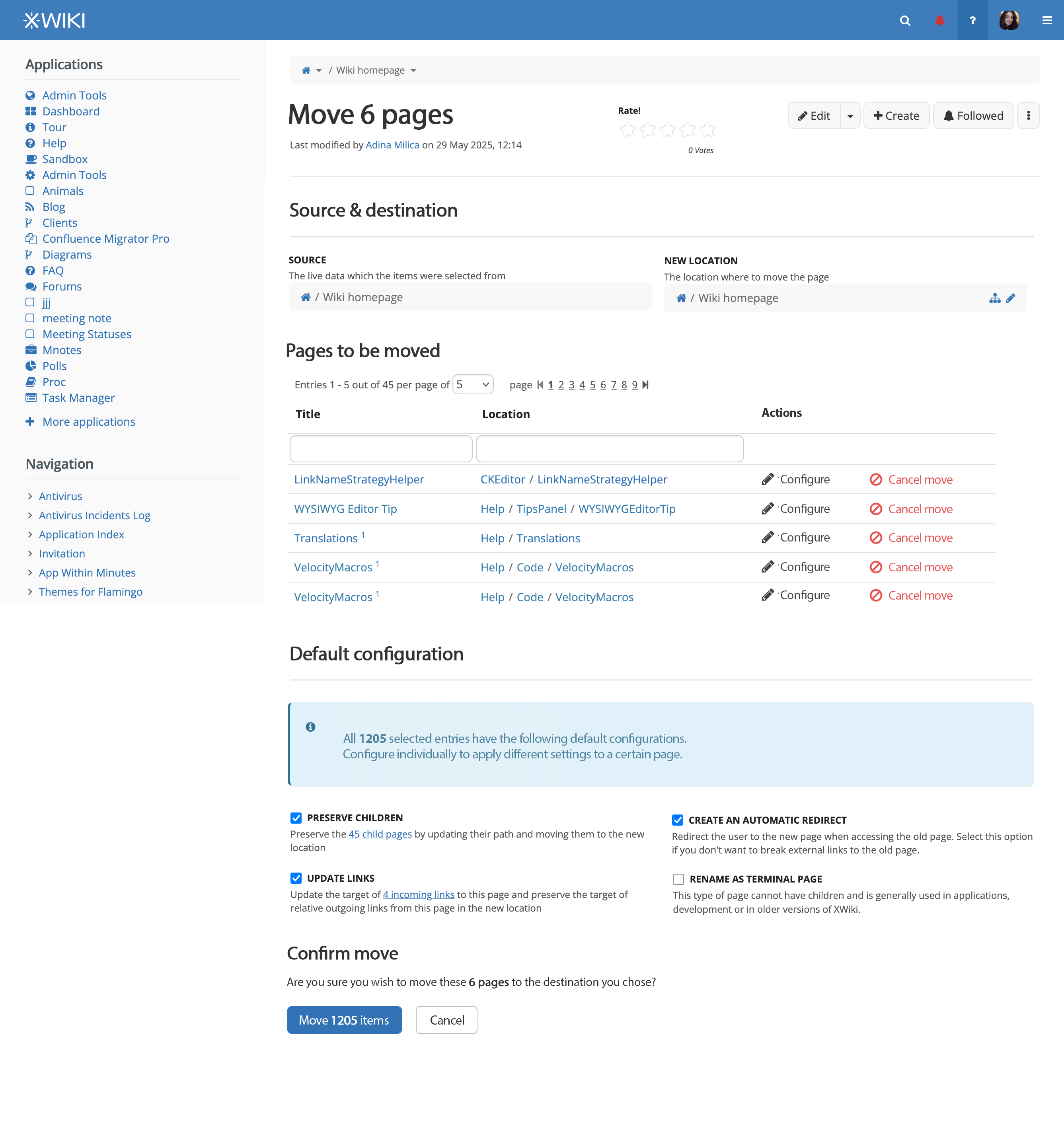 After selecting a number of items in a Live Data table, the user chooses Move and is led to the following screen.