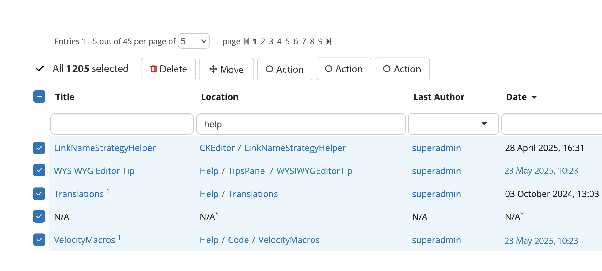If the user navigates to another page after selection, the row of batch actions disappears and all checkboxes get reset to state 0 (unchecked).