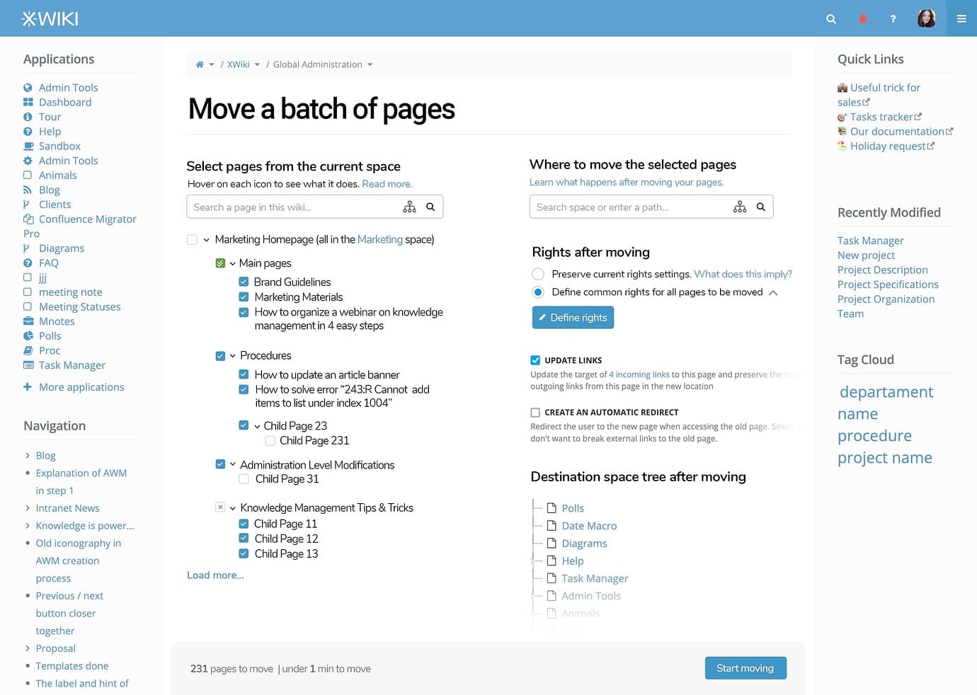 The section “Destination space tree after moving” will contain a warning box stating the number of pages selected and warning the user to set a destination path.
