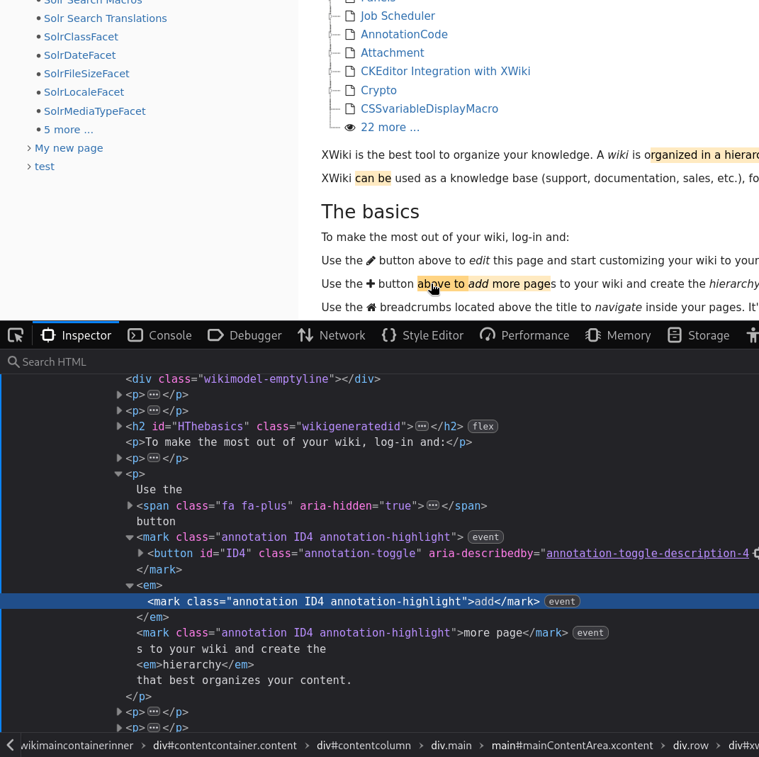 Right now, annotations are split into multiple HTML nodes. Each text node in the selected text is wrapped into an annotation node. This node provides the “highlighted” style, and the interactivity is done through the post-it button that appears at the end of the annotation: