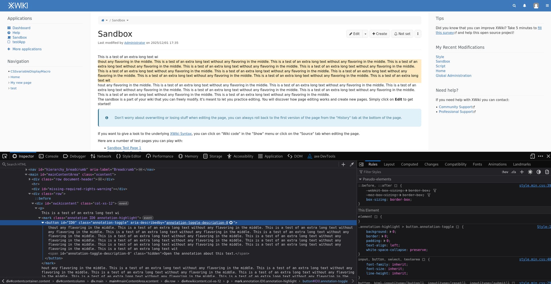 But there’s still a problem. In cases where the mark is split in a lot of parts (like the screenshot above), it would create that many buttons and crowd the tab index for little use (all the buttons do the same thing – open the annotation bubble). I decided to only add a button on the first mark of each annotation. The negatives left with this solution: