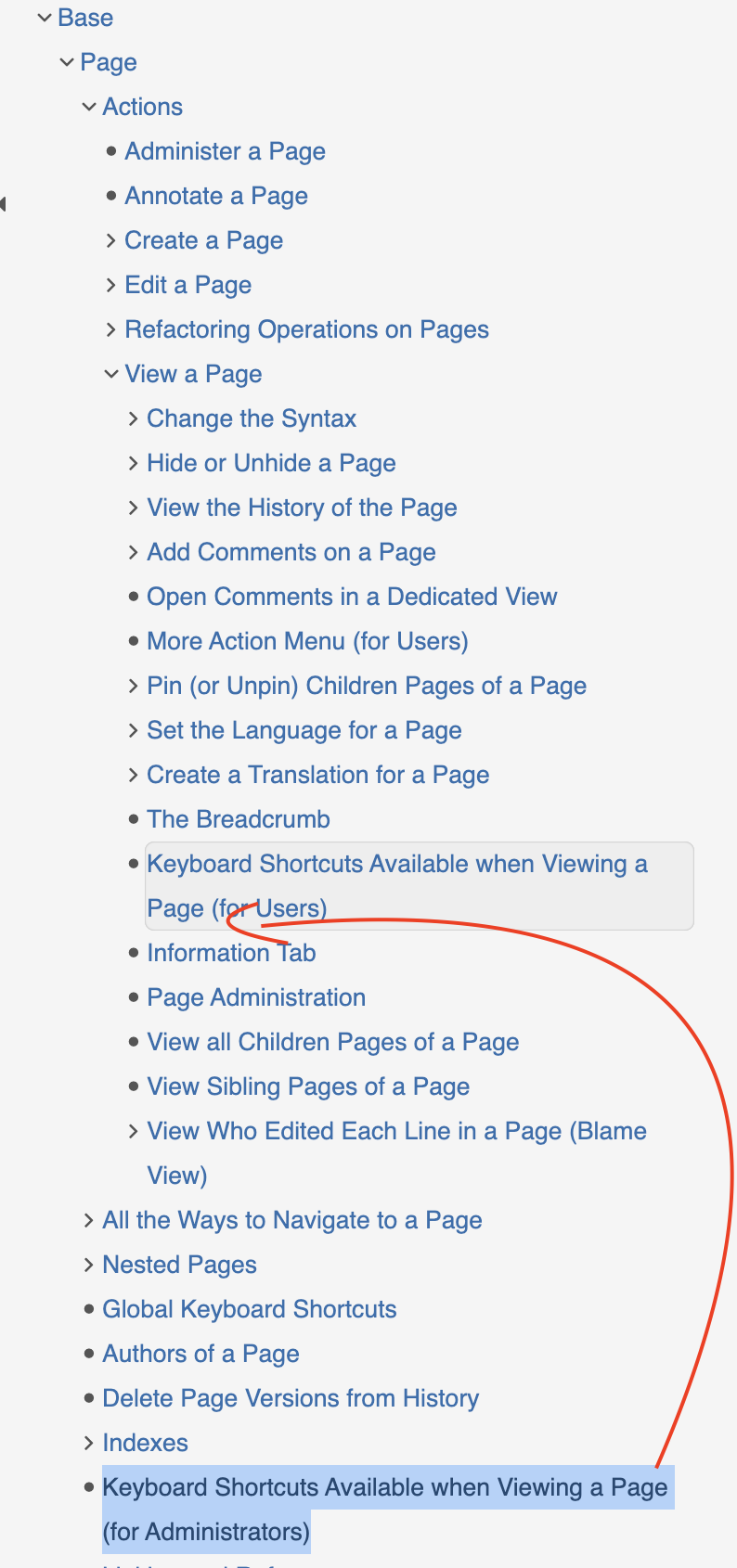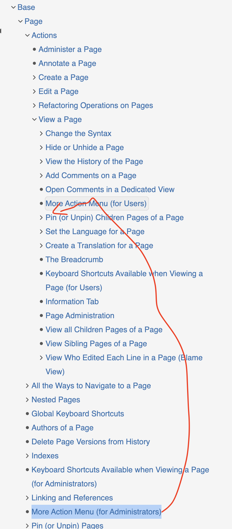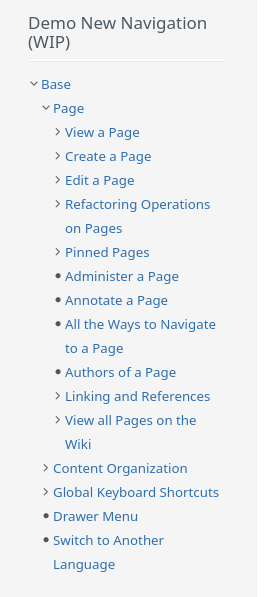 I’ve made a slight modification to the existing navigation to simulate Option 3, where we mix the pages for all targets. Specifically, I’ve adjusted the navigation for the “Base” topic and the “Page” subtopic by moving the child pages from the Administer section to the User section. This modification is a demo to visualize how this option would work in practice.