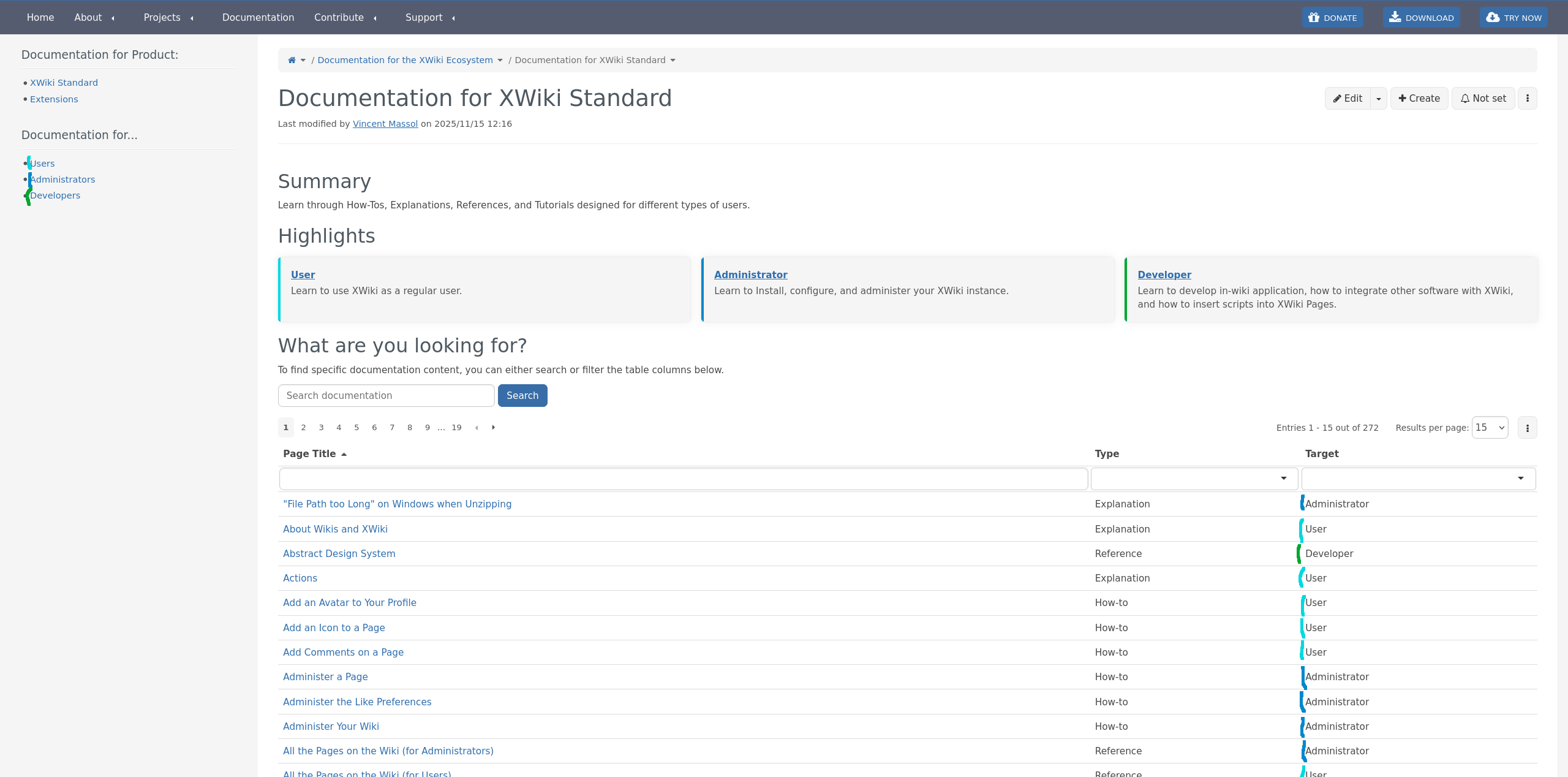 Currently, documentation is splitted by Product (XWiki Standard and Extensions), then by Target (User, Administrator, Developer). The navigation changes based on what Product and Target the user selects. So, after selecting the Product and Target, a list of topics is displayed below in the navigation. This helps users filter the page they might be looking for based on their role in the wiki. Topic pages (top level pages) are pinned in the navigation by relevance.