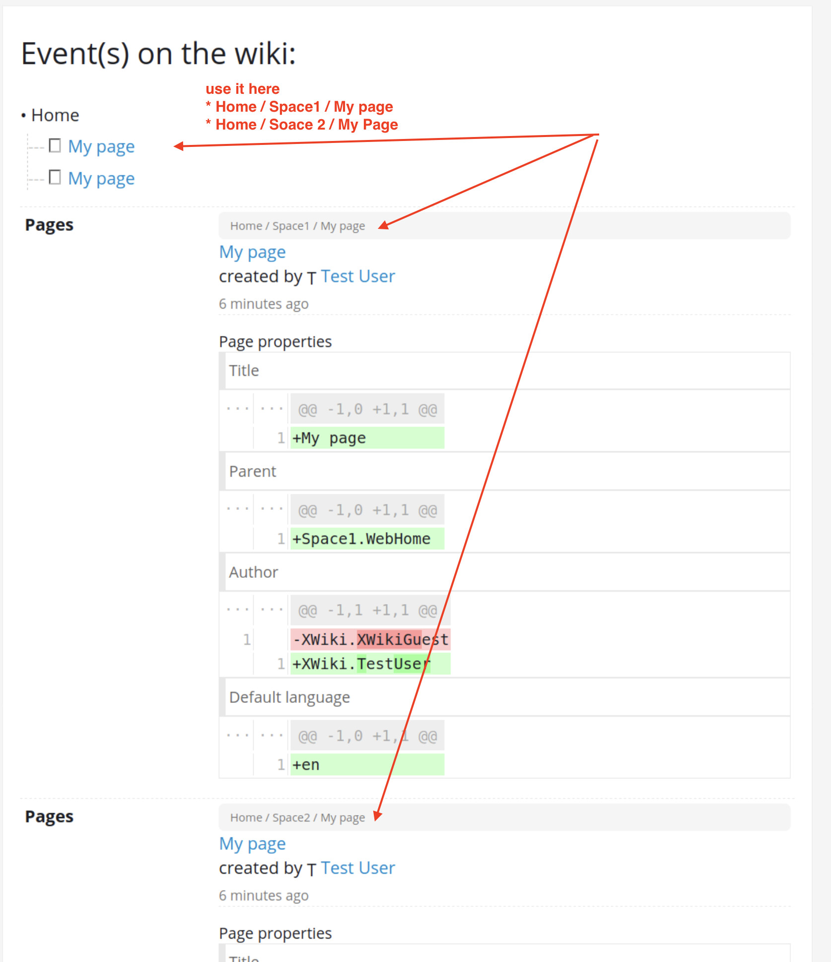 It means that if an email contains event for following pages: Space1.Page1, Space1.Page2, Space1.Page1.SubPage