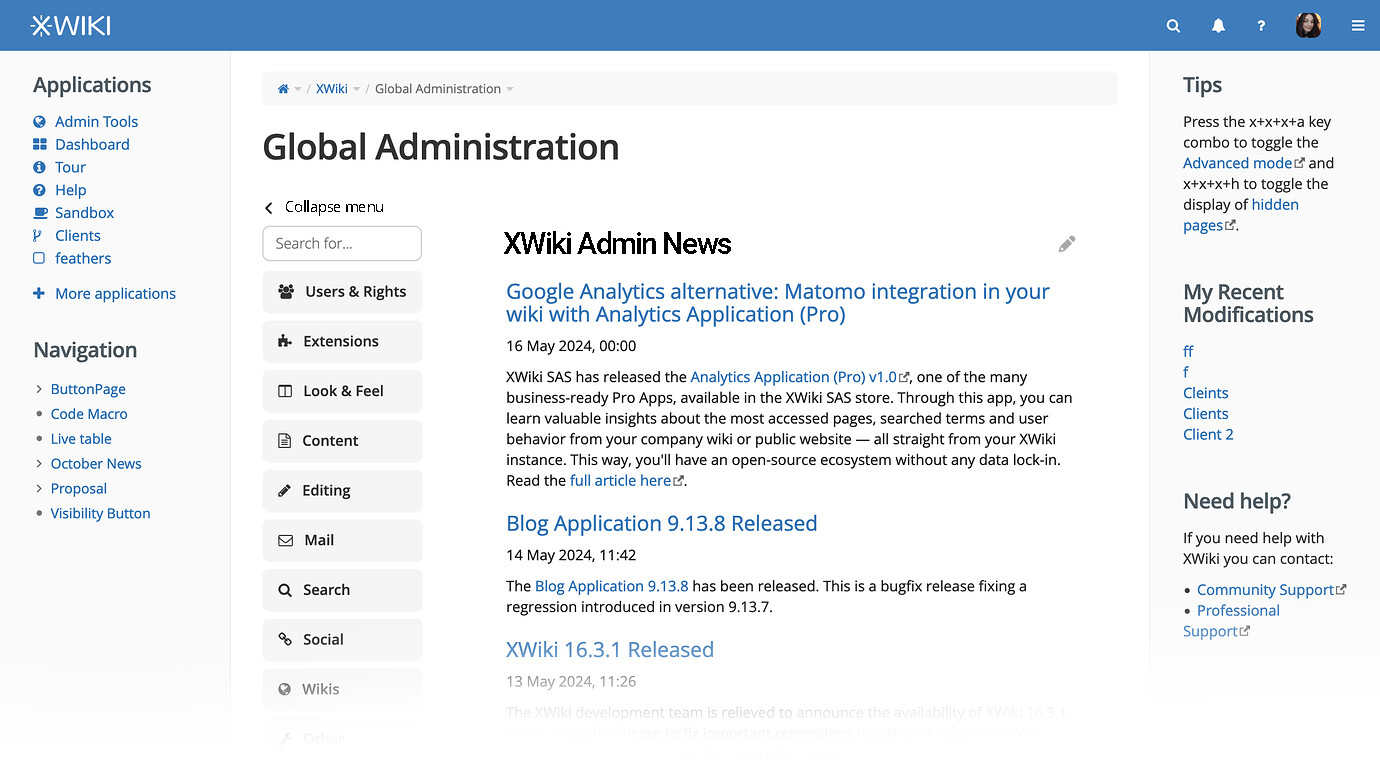 a new textarea xpropriety to the XWiki.XWikiPreferences xclass in which by default we have what’s new articles, but can be populated with any macro the admin wants