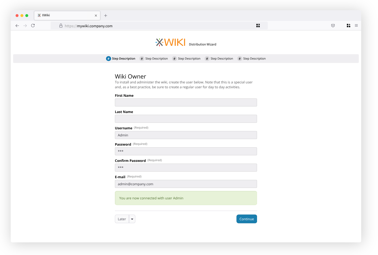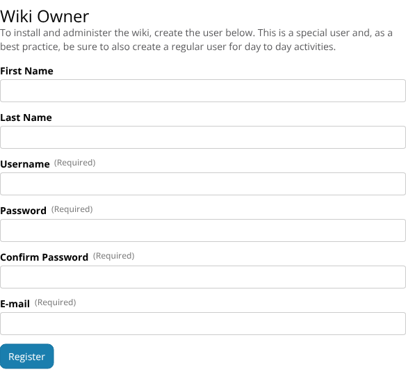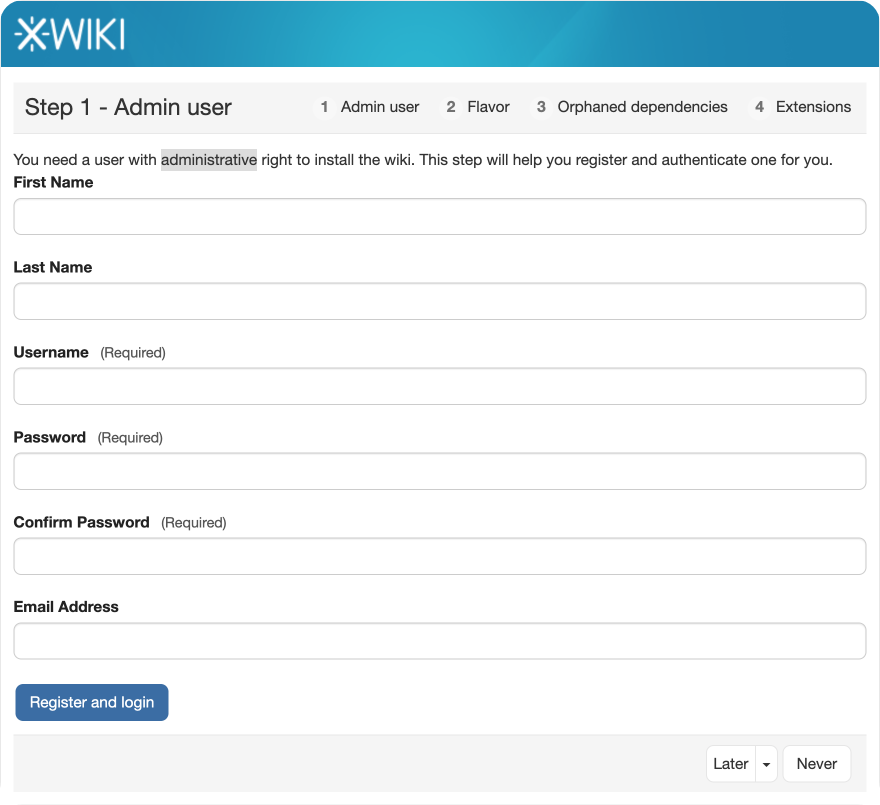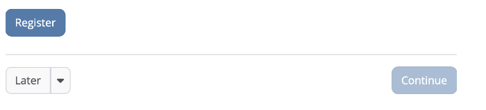 Still regarding button order, I’d like to propose that the “Continue” button is never hidden, only disabled based on the required actions in each step. For instance, in the Admin user step, the Continue button is hidden and the “Register” button takes the priority on a different place in the UI. This can cause users to be confused because 1 - the position of the button changed 2- the button text is different, pictured below: