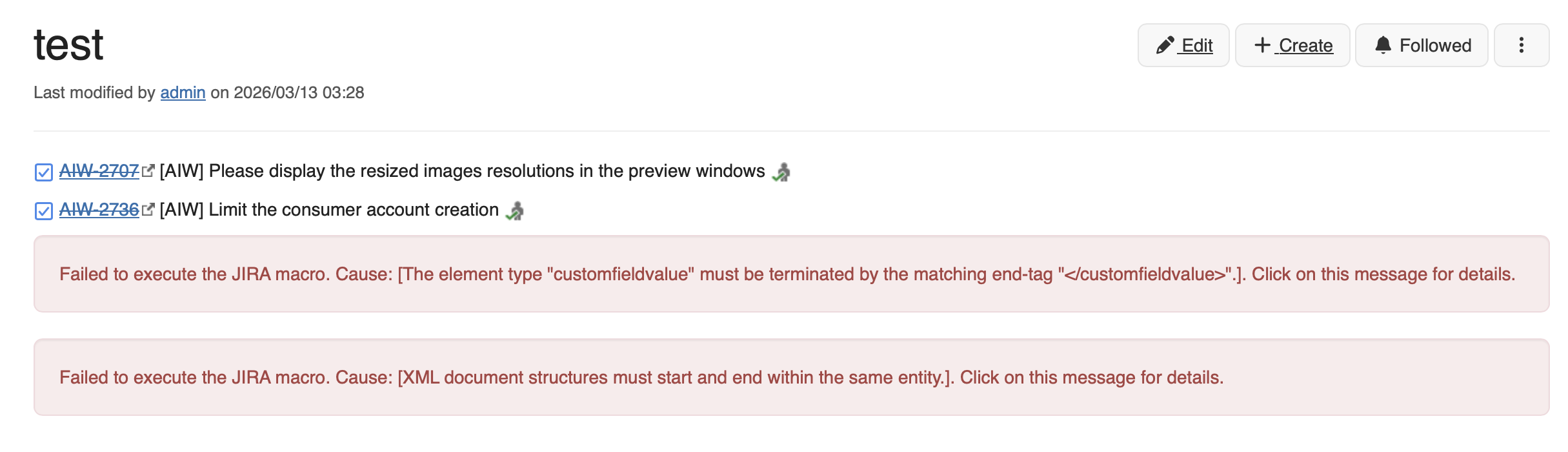 Failed to execute the JIRA macro. Cause: [The element type “customfieldvalue” must be terminated by the matching end-tag “”.]. Click on this message for details.