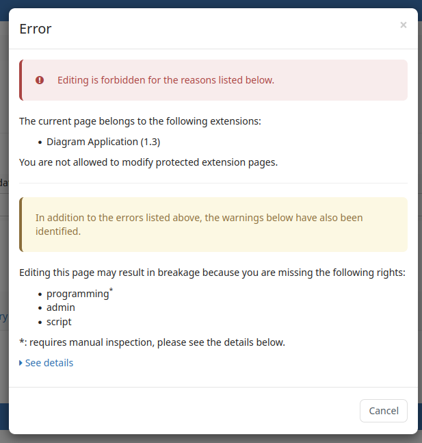 Hello, I looked through the pages with enforced rights in Admin-Tools and saw that most of them were editable by regular users. There is the warning dialog but users can confirm and break the underlying XWiki/Extension functionality like this because they lack e.g. programming permission. I had to check these pages and harden the permissions myself.