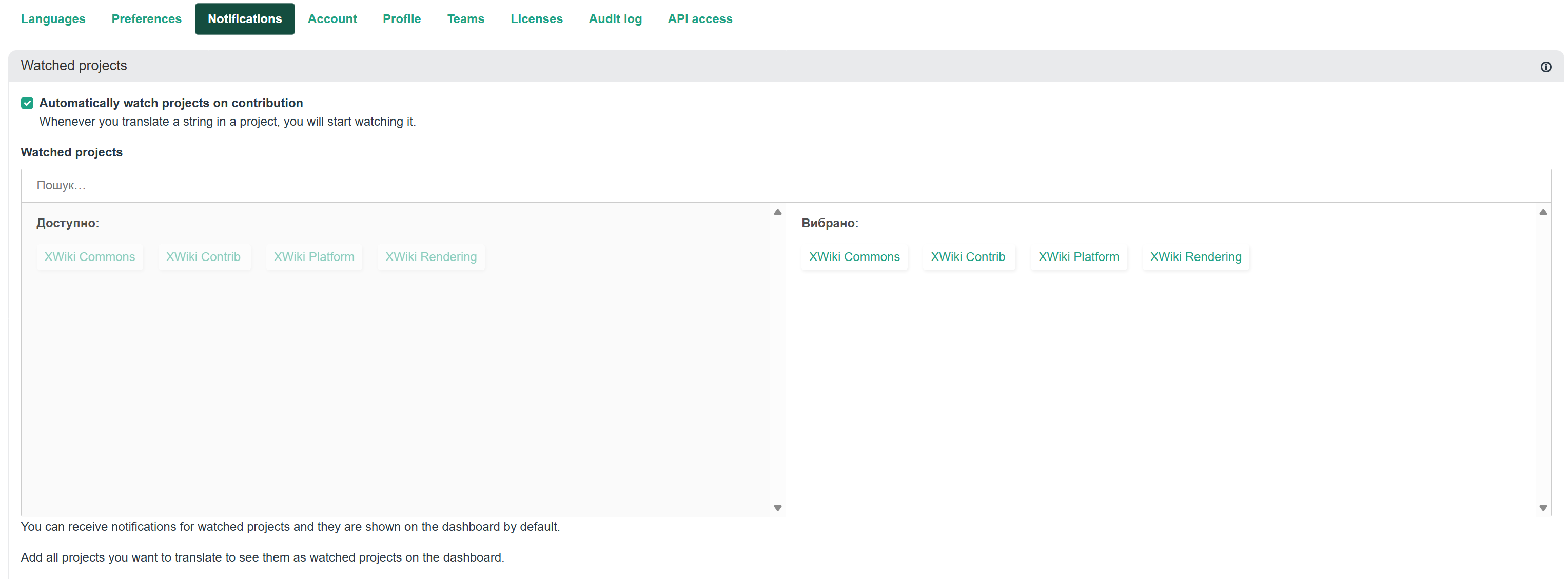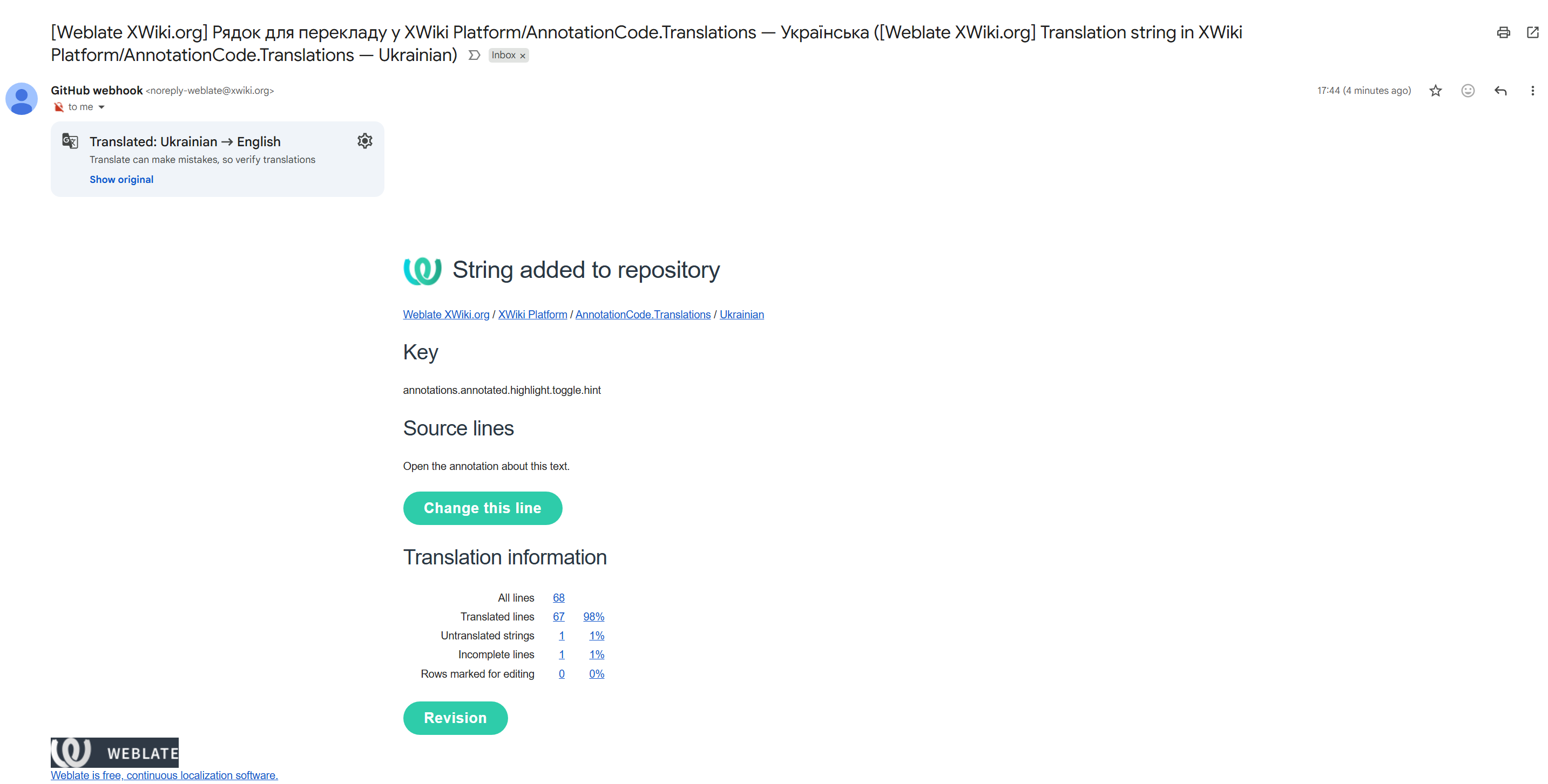 @Simpel I confirm with my default setting there’s no notification, I haven’t checked the Weblate repo itself long ago (including the off doc). I can only advise you to manually check once a week or more frequently this page German @ Weblate XWiki.org where you can follow up on the untranslated lines.