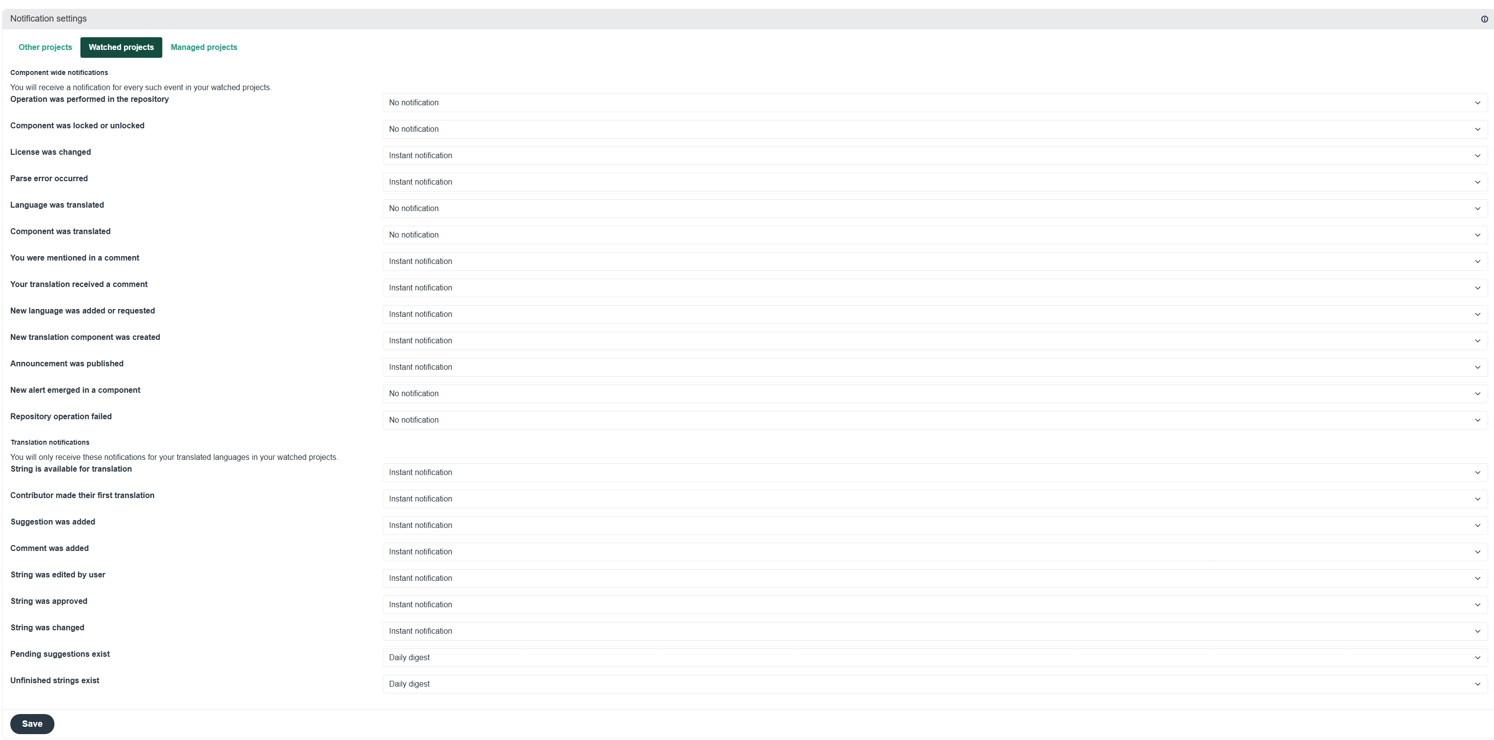 By that way I recognized that I did not get emails a long time ago. My settings say that it should notify me if there are new elements to translate but it didn’t. (There were some new elements.)