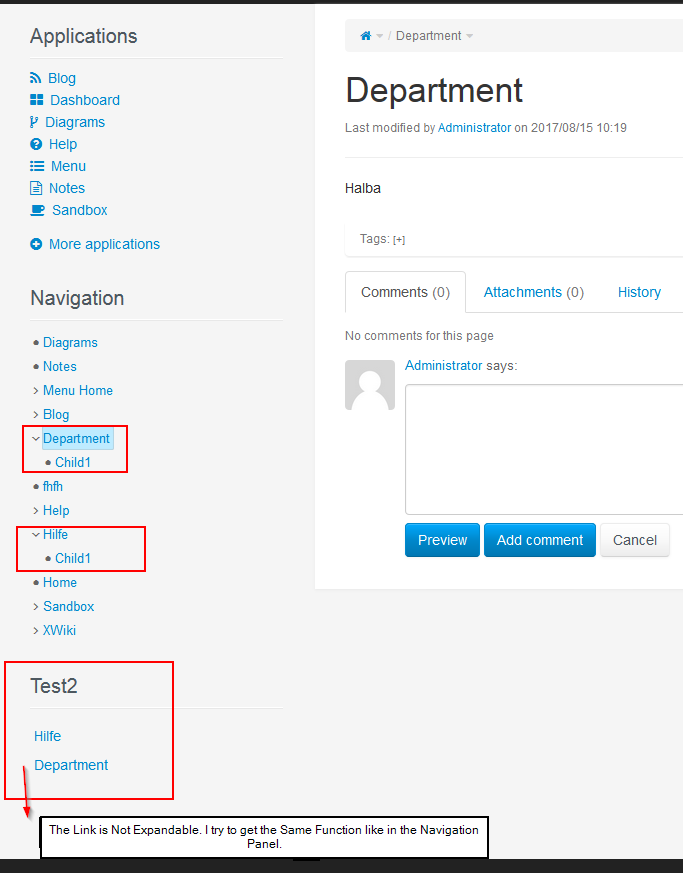 Then the Correct Site Opens, BUT on my Created āDeparment-Helpā will Collaps and in the Default Navigation Panel it is open correctly. My goal is to achieve the same Feature like the Navigation Panel (The manu should stayed opened on the Position the User opened the last Xwiki Site (we will have many many Child (and Subchild) Sitesā¦):