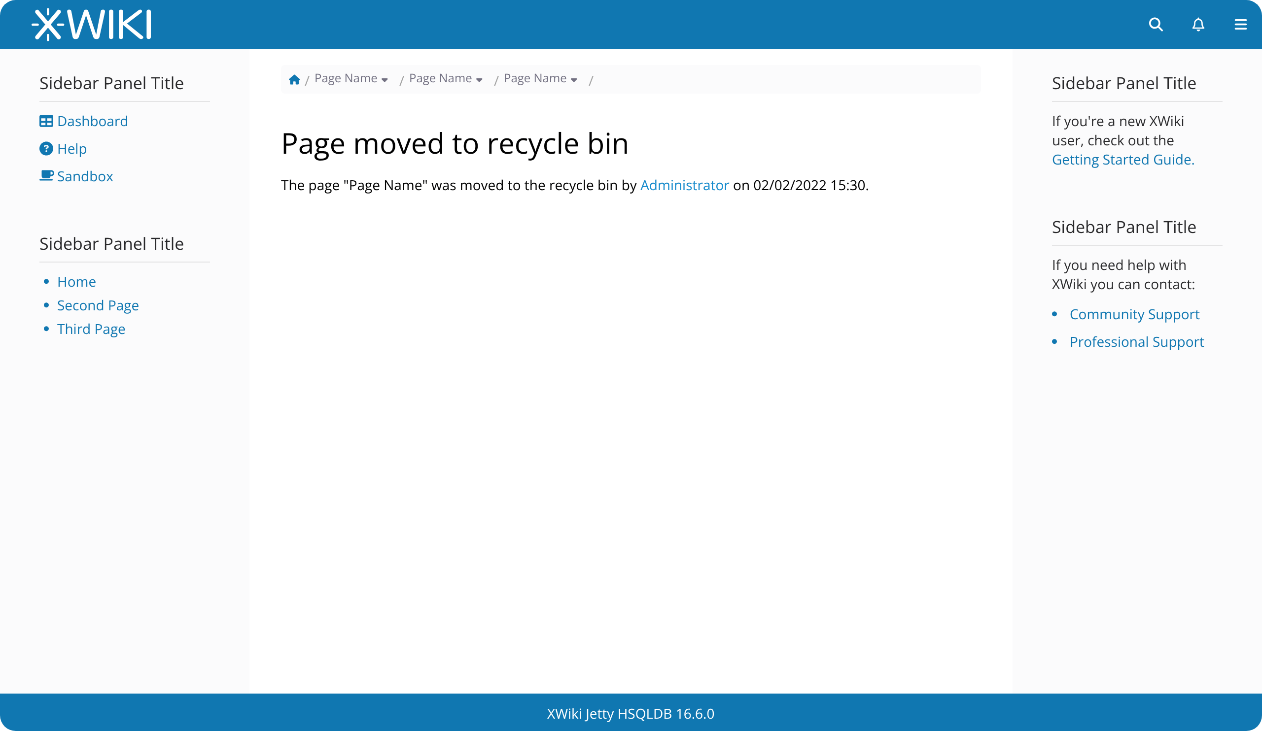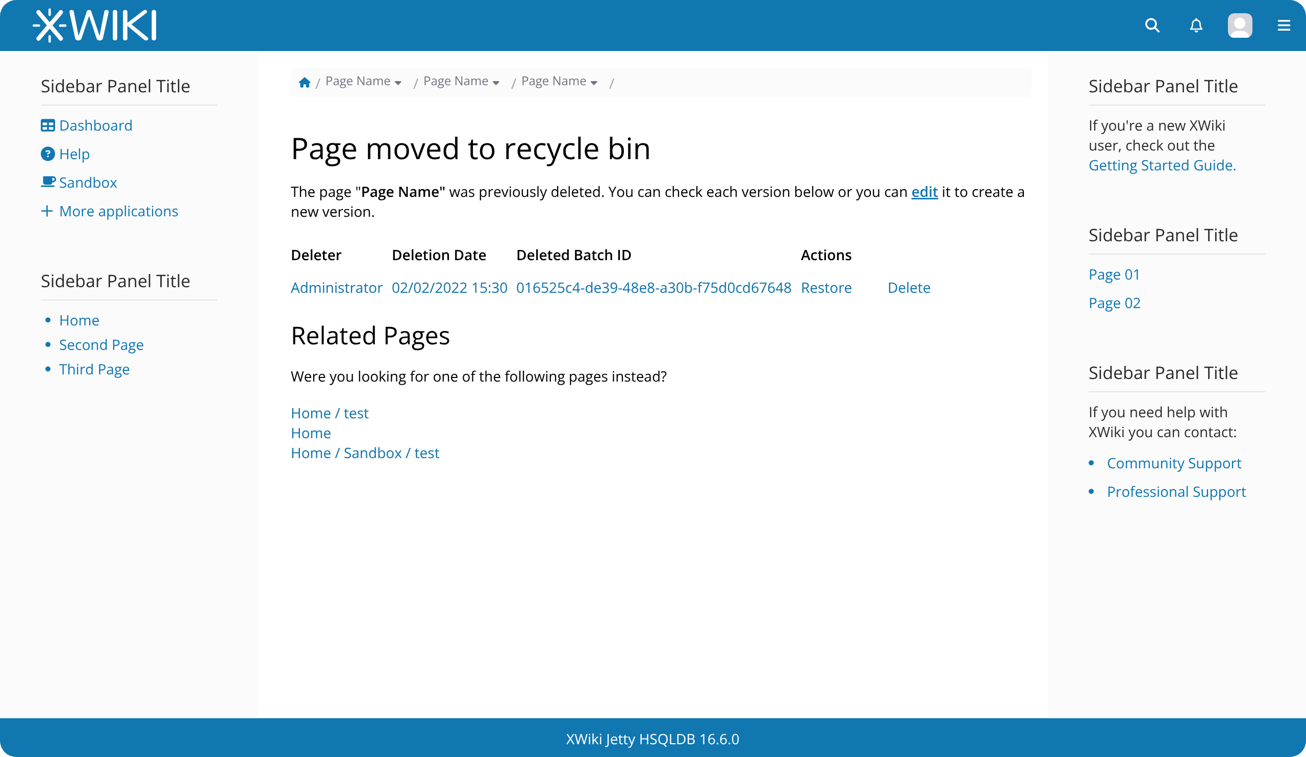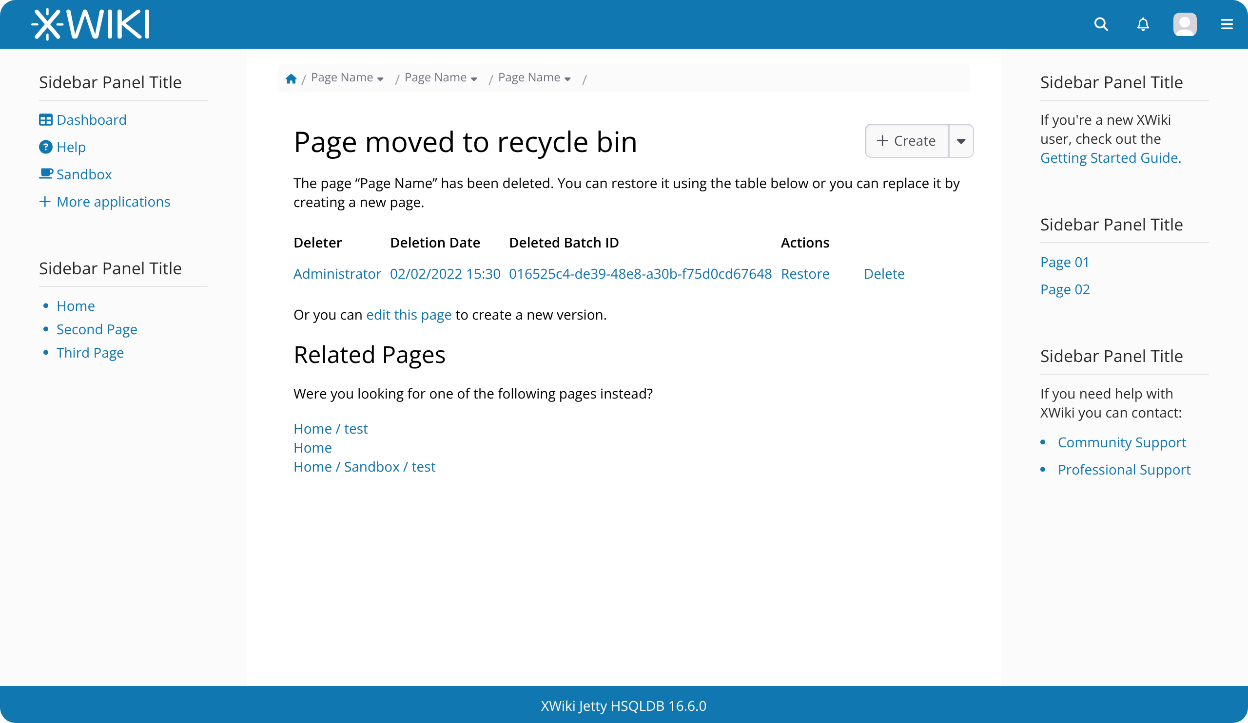 The page “Page Name” has been deleted. You can restore it using the table below or you can replace it by creating a new page.
