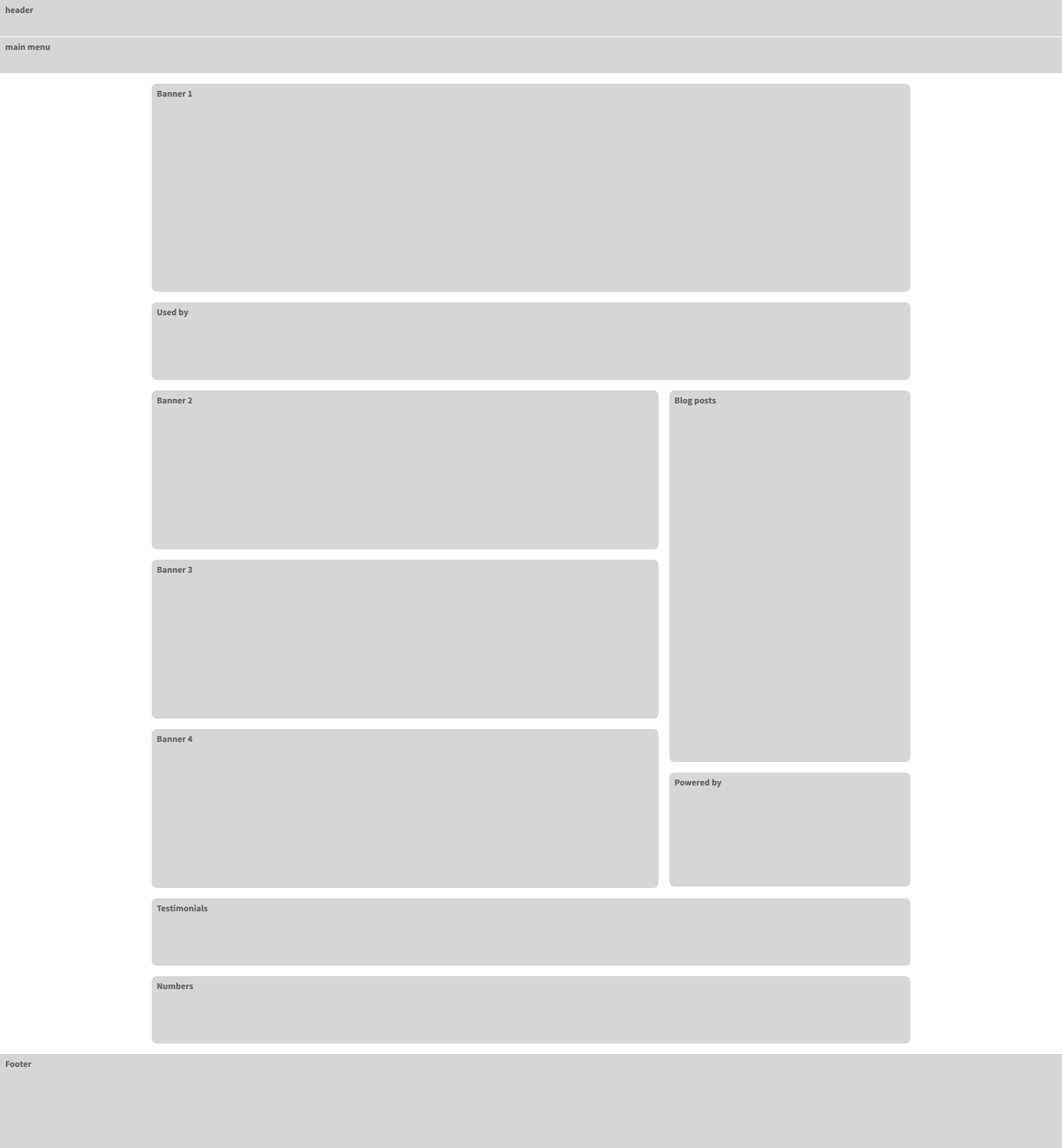 To accommodate the new sections derived from the banner, we propose relocating the blog posts section, testimonials, and the “Powered By” area, listed in this order of priority, as illustrated below.