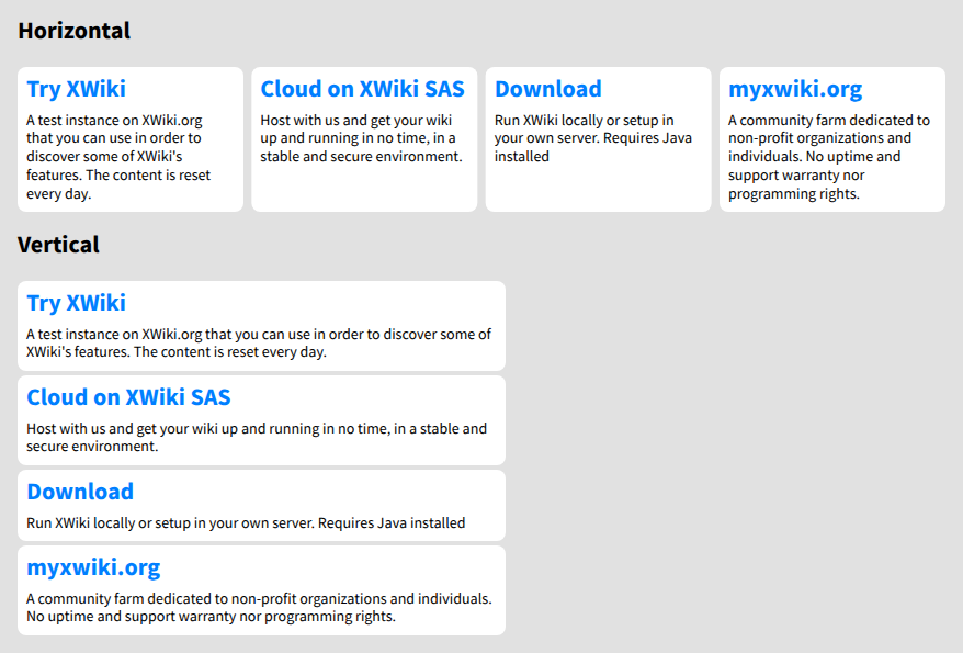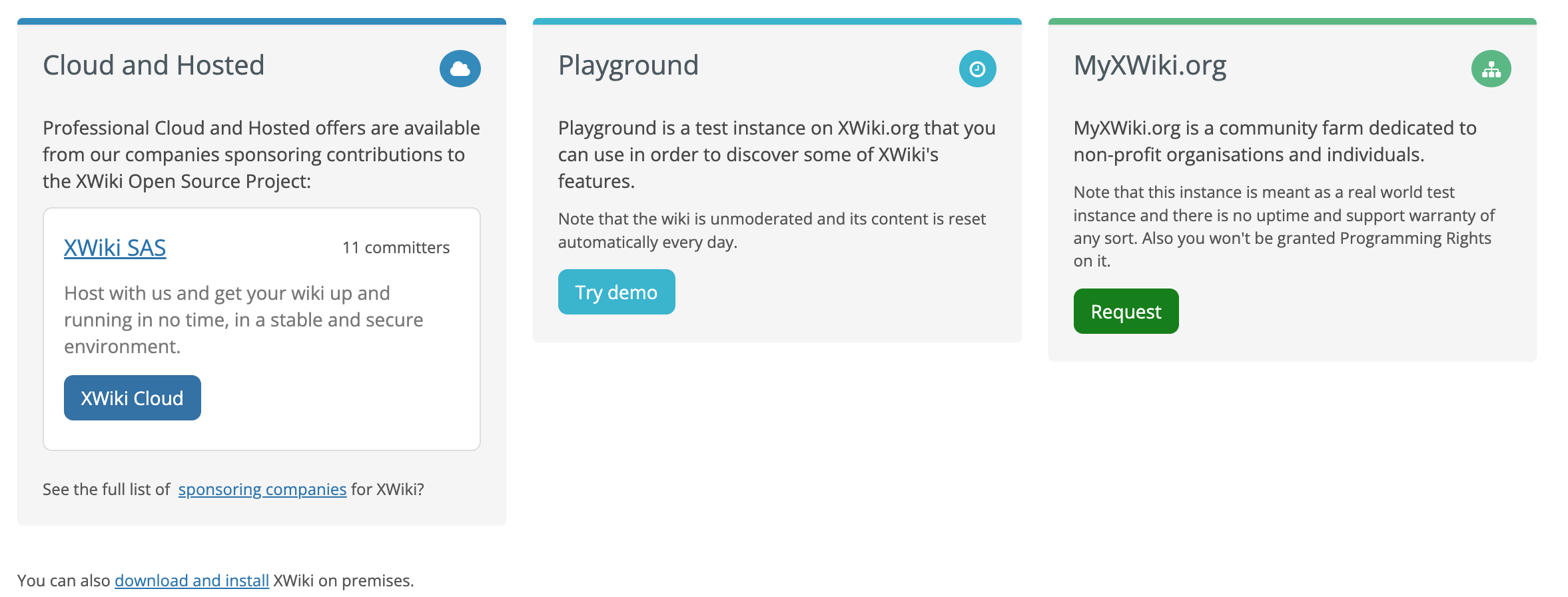 - MyXWiki.org – Community farm for nonprofits and individuals (no support or uptime guarantee).