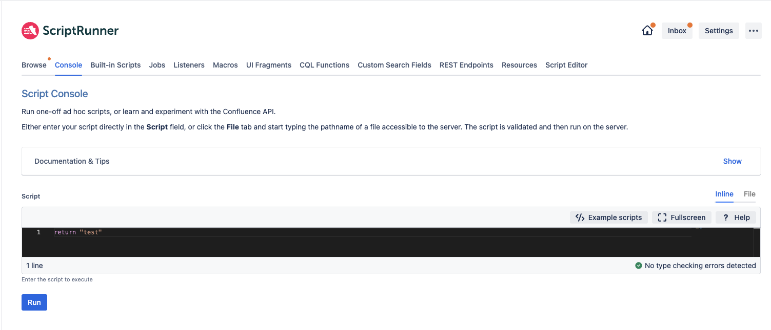 What I do personally, is create a page, type my script and click “preview”. I don’t save the page (unless I want to keep it, in which case, I put some protection in the script so that it doesn’t execute when the page is rendered).
