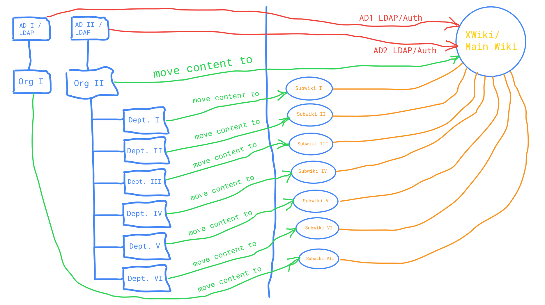 My question is how best to implement user login, since the users come from different, separate Active Directories. It should later be possible for users/groups from Organization 1 to access subwiki pages belonging to Organization 2, and vice versa.