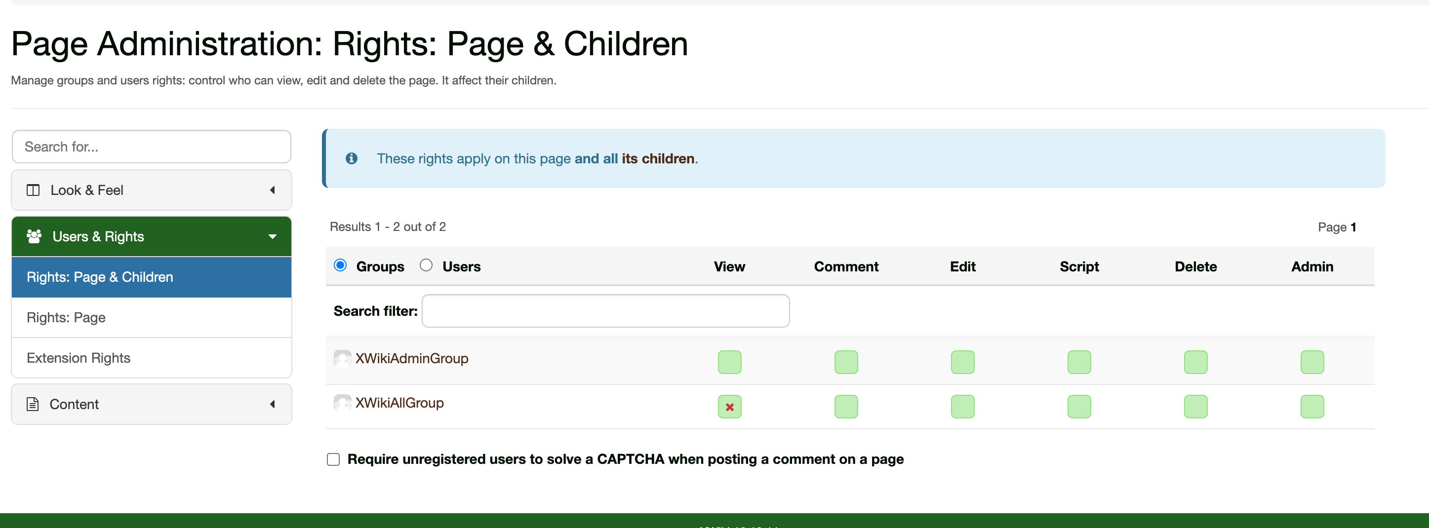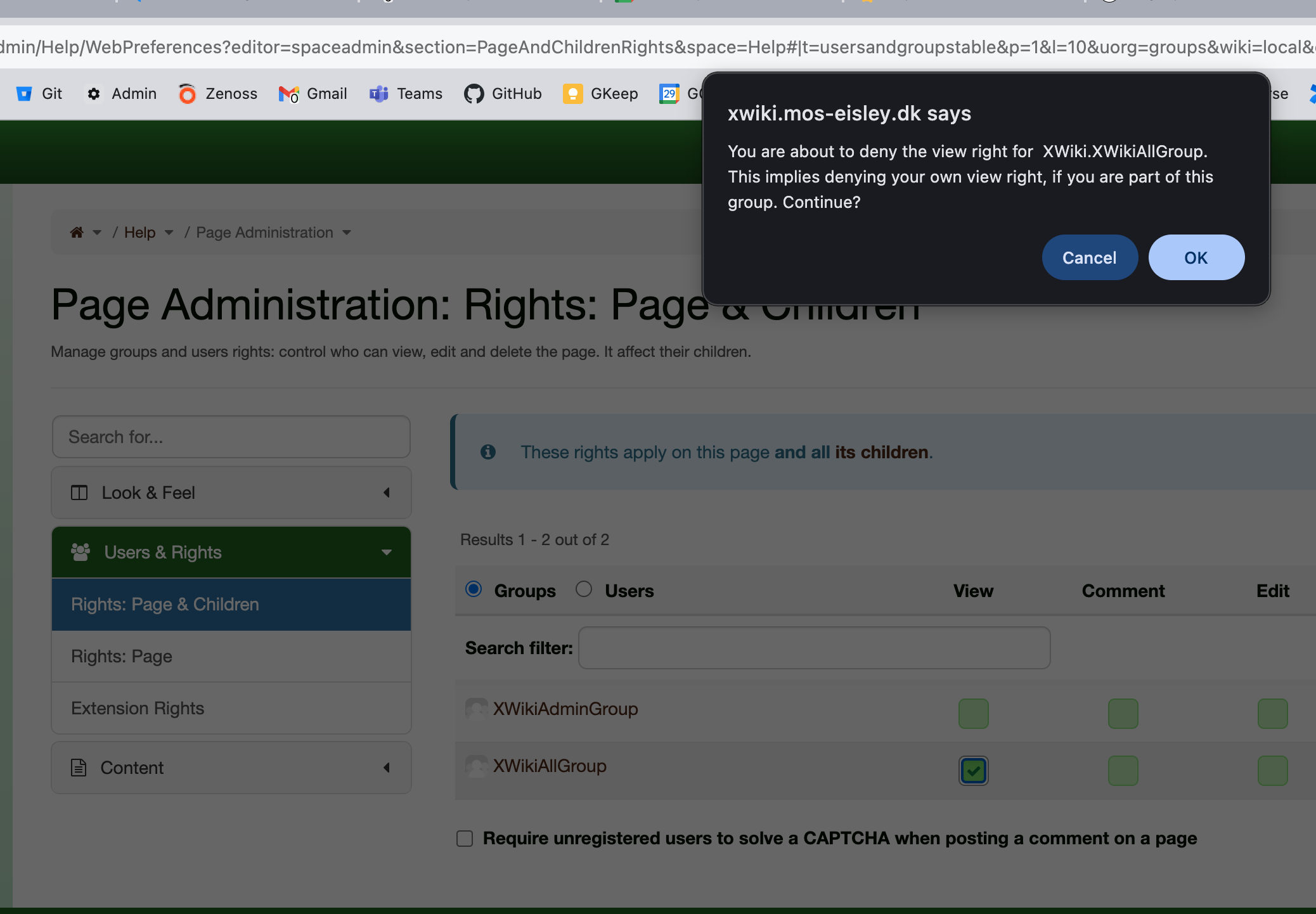 I can give myselv full access and user and disable view for “XWikiAdminGroup” also.