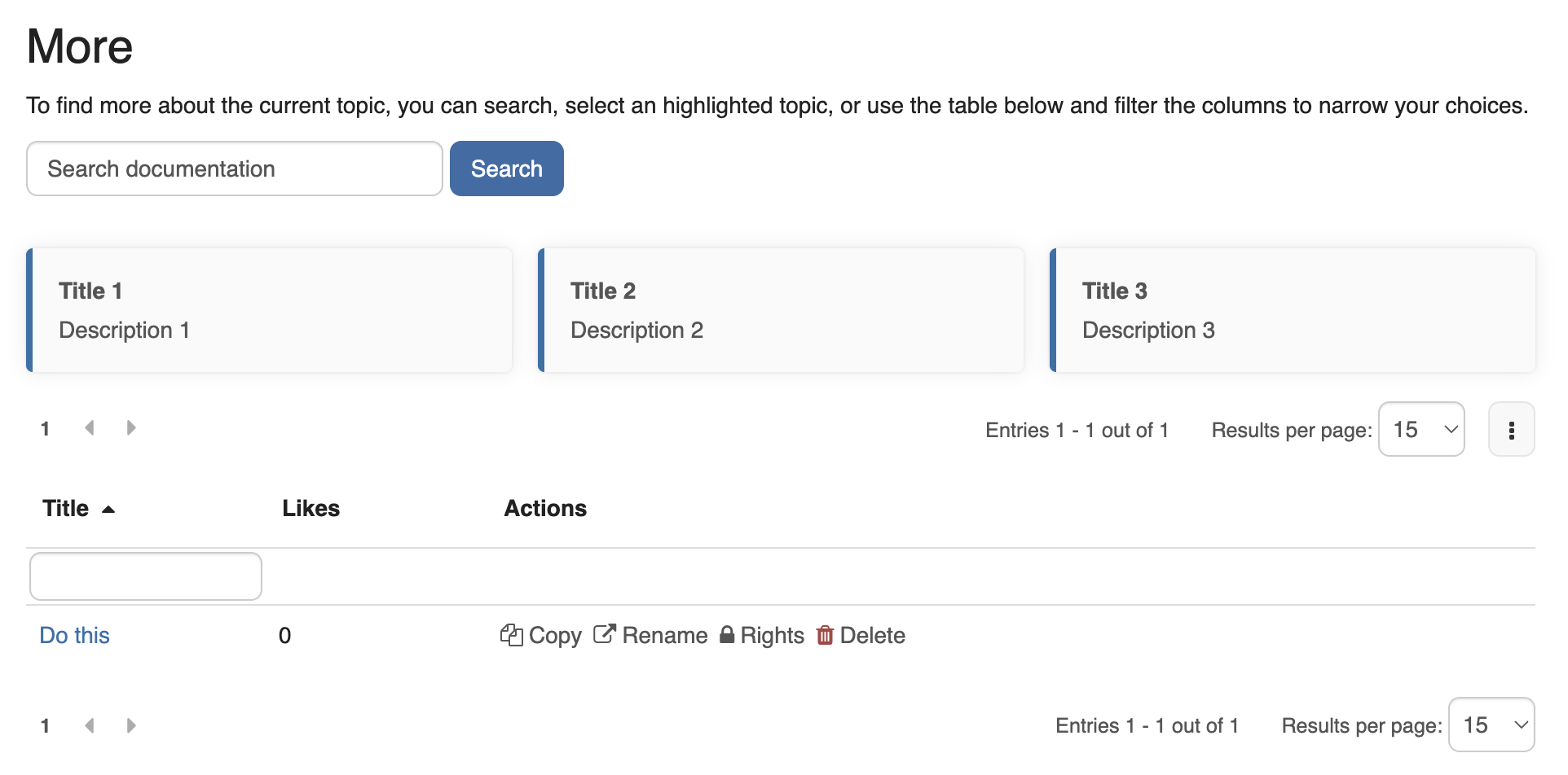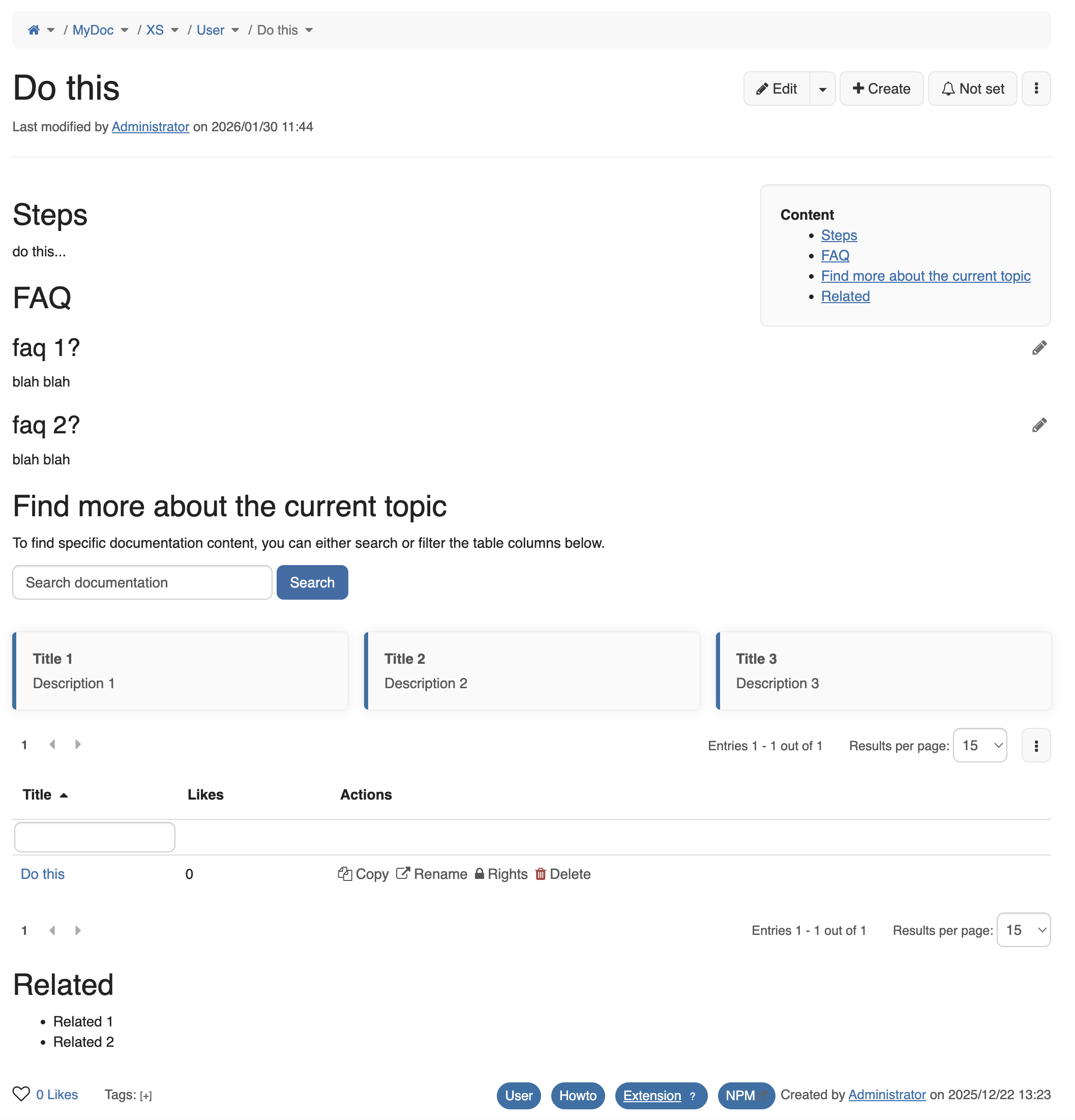 This means include the “Highlights” section and the search box on every documentation page. Both will be displayed under “Find more about the current topic” (which replaces “What are you looking for?”). The “Highlights” section is still optional, as proposed and agreed before.